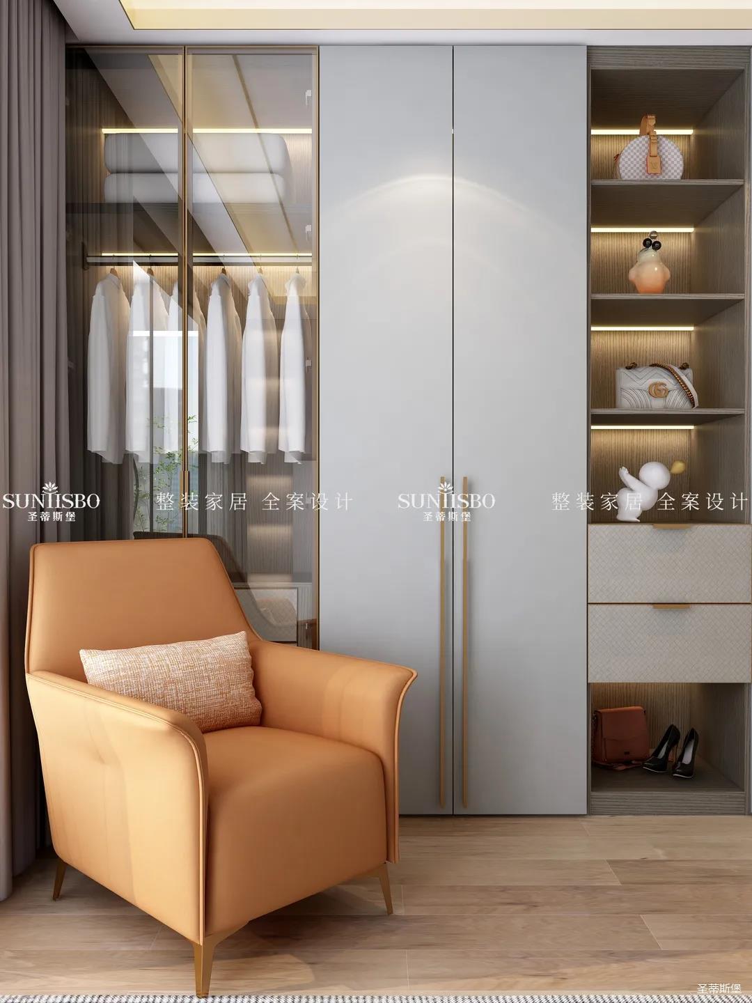 衣帽间选择浅灰作为空间主色调,设计师在衣帽间用与整体空间相似的爱马仕橙作为点缀,使空间具有“简于形,奢于心”的时尚审美内涵。
